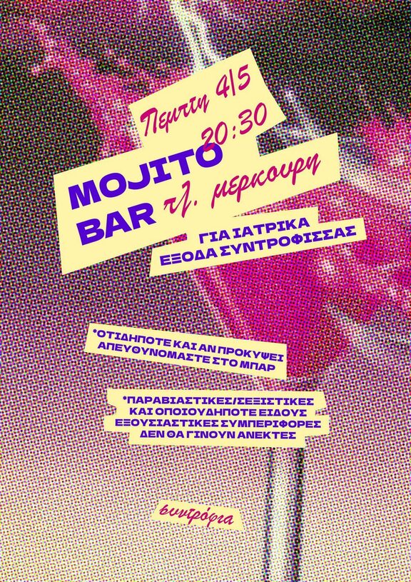 Την Πέμπτη 4 Μαΐου στις 20:30 διοργανώνουμε στην πλατεία Μερκουρη mojito bar οικονομικής ενίσχυσης για τα ιατρικά έξοδα της Α.
