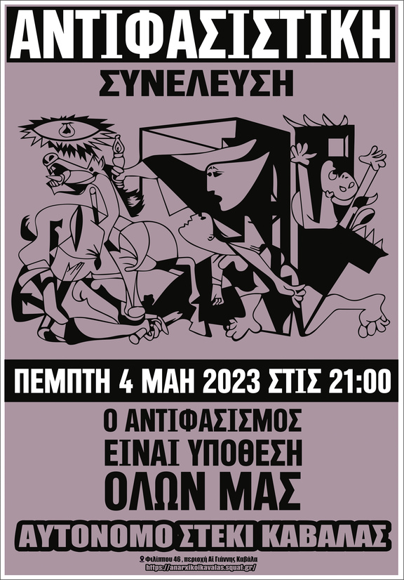 Ανοιχτή αντιφασιστική συνέλευση , στο Αυτόνομο Στέκι Καβάλας , στις 4 Μάη του 2023 στις 21:00. Ο αντιφασισμός έιναι υπόθεση όλων μας.