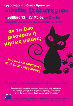 Το Σάββατο 13 και 27 Μαΐου 2023, στις 12-2μμ, στο εργαστήρι παιδικών δράσεων «Φτου Ξελευτερία» συζητάμε για τα ζωάκια και πως επικοινωνούμε μαζί τους, παίζουμε και κάνουμε κατασκευές για τα ζώα της γειτονιάς.