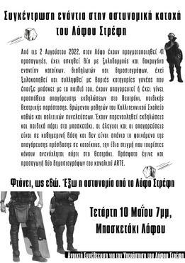 Με αφορμή την δημιουργία σταθμού ΜΕΤΡΟ στην πλατεία Εξαρχείων και την ανάπλαση/ εμπορευματοποίηση του λόφου Στρέφη οι συμμορίτικες ομάδες της ΔΡΑΣΗ, ΟΠΚΕ και των ΜΑΤ έχουν στρατοπεδεύσει μόνιμα τόσο περιμετρικά της πλατείας όσο και στον λόφο του Στρέφη και λειτουργούν με όρους στρατού κατοχής ασκώντας υπέρμετρη χρήση βίας προς πάσα κατεύθυνση. Χρησιμοποιούν αυτά τα σημεία ως ορμητήρια τους και δεν χάνουν ευκαιρία να το αποδεικνύουν σε διερχόμενους και σε όσους αντιστέκονται στην εξουσία που τους έχει απονεμηθεί από το κράτος προχωρώντας σε εξευτελισμούς και βίαιους ξυλοδαρμούς. Πιο πρόσφατα περιστατικά της κτηνώδους βίας τους αποτέλεσαν η κακοποίηση γυναίκας από αστυνομικούς εντός του εργοταξίου στην πλατεία επειδή αντιμίλησε σε σεξιστικά σχόλια, η επίθεση και σύλληψη δικηγόρων στην πλατεία Εξαρχείων καθώς επίσης και στις αρχές του Οκτώβρη ο ξυλοδαρμός ενός πατέρα στο λόφο του Στρέφη που ξυλοκοπήθηκε βάναυσα μπροστά στα δύο του παιδιά επειδή διαμαρτυρήθηκε λεκτικά στην επίθεση που δέχτηκε συντρόφισσα. Η στρατοπέδευση αστυνομικών δυνάμεων έξω από το δημοτικό σχολείο στο λόφο Στρέφη με σκοπό τον εκφοβισμό γονιών και παιδιών ( διόλου τυχαία μετά την ανακοίνωση που εξέδωσε ο σύλλογος γονέων ) απλώς επισφραγίζει ότι η κυβέρνηση όχι μόνο δεν αναδιπλώνεται μετά από επιθέσεις αλόγιστης βίας της ΕΛ.ΑΣ αλλά αναλαμβάνει και την πολιτική ευθύνη.