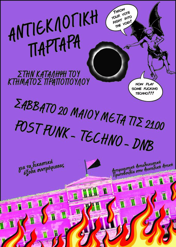 Η αντιεκλογική παρτάρα θα γίνει το Σάββατο 20 Μαΐου μετά τις 21.00, στην κατάληψη του κτήματος Πραποπούλου.