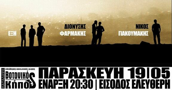 Στις 19 Μαϊου ο Βοτανικός κήπος θα φιλοξενήσει τους Νίκο Γιακουμάκη, Έξη και τον Διονύση Φαρμάκη στον εξωτερικό χώρο της κατάληψης για ένα live οικονομικής ενίσχυσης συνδιάζοντας τρία διαφορετικά μουσικά σχήματα με κοινές όμως ιδέες και συμπράξεις στο παρελθόν.