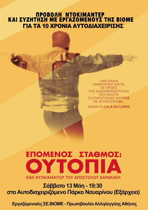 10 χρόνια αυτοδιαχείρισης - Προβολή του ντοκιμαντέρ "Επόμενος σταθμός: Ουτοπία" και συζήτηση με εργαζόμενους της Σ.Ε.ΒΙΟΜΕ, Σάββατο 13 Μάη, 19:30, στο Αυτοδιαχειριζόμενο Πάρκο Ναυαρίνου στα Εξάρχεια.