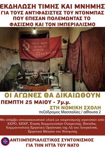 Καλούμε κάθε εργάτη και εργάτρια, νέο και νέα, αντιφασίστα και αντιφασίστρια, με τις γροθιές μας ψηλά, να τιμήσουμε τους νεκρούς ήρωες της αντιφασιστικής, αντιιμπεριαλιστικής πάλης του λαού του Ντονμπάς στην εκδήλωση που θα πραγματοποιηθεί τη Πέμπτη 25 Μαΐου στις 19:00 στη Νομική (αίθουσα 2- πεζόδρομος Μασσαλίας). Επιπλέον, θα ακούσουμε τη φωνή και τις τοποθετήσεις μαχητών και αγωνιστών από: Ένωση Κομμουνιστών Ουκρανίας που αγωνίζονται στο έδαφος της Ουκρανίας, την Ουκρανική οργάνωση Borotba, το Κομμουνιστικό Κόμμα Ρωσικής Ομοσπονδίας, το Κομμουνιστικό Εργατικό Κόμμα Ρωσίας, τη Κομμουνιστική Εργατική Οργάνωση της Λαϊκής Δημοκρατίας του Λουγκάνσκ, και το Εργατικό Μέτωπο του Ντονμπάς.