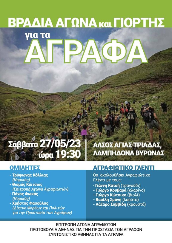 Το Σάββατο 27 Μαΐου 2023, στον Βύρωνα της Αθήνας (Πάρκο Λαμπηδόνας), διοργανώνουμε μια Βραδιά αγώνα και γιορτής για τα Άγραφα. Σκοπός μας είναι να προστατεύσουμε αυτόν τον τόπο κάνοντας τα αδύνατα, δυνατά. Κι αυτό, όχι για να καταστήσουμε τα Άγραφα απλά και μόνο έναν ακόμα τουριστικό πόλο έλξης, όπως είθισται να λέγεται, αλλά ένα σημείο αναφοράς για αυτό που ήταν και ακόμα συμβολίζουν: έναν τόπο απαράμιλλης φυσικής ομορφιάς, αντίστασης και ελευθερίας. Αυτό είναι το δικό μας καθήκον: απλά να κάνουμε το νερό να ξαναπερνά από εκεί που περνούσε για αιώνες τώρα.