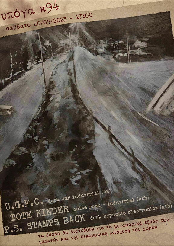 Το Σάββατο 20/5 από τις 21.00, για τελευταίο λάιβ της φετινής σεζόν εντός υπόγας, συμπράττουμε σε μια αυτοοργανωμένη συναυλία με τους P.S. Stamps Back(ATH), Uncle Grasha's Flying Circus(CZ) και Tote Kinder(ATH). Χωρίς να βλέπουμε το d.i.y. ως ένα πιασάρικο tag αλλά ως ένα θεωρητικό και πρακτικό πεδίο διαρκούς ζύμωσης, μέσα από το οποίο συλλογικοποιούμαστε και συνάπτουμε πολιτικές σχέσεις.
