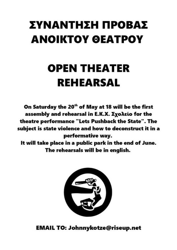 On Saturday the 20th of May at 18 will be the first assembly and rehearsal in Ε.Κ.Χ. Σχολείο for the theatre performance "Lets Pushback the State". The subject is state violence and how to deconstruct it in a performative way.