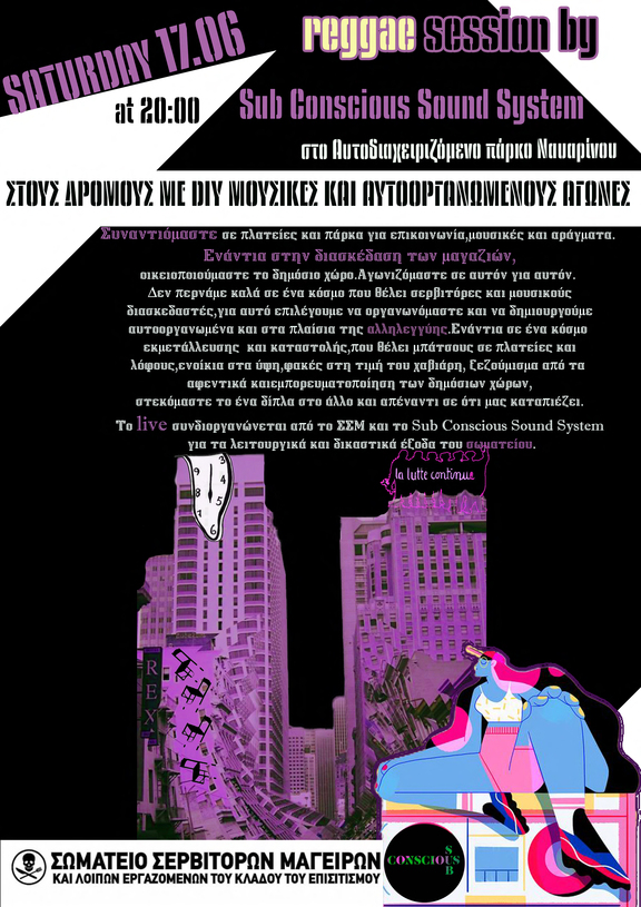 Το Σάββατο 17 Ιουνίου συνδιοργανώνουμε το Σωματείο Σερβιτόρων Μαγείρων και το Subconscious SoundSystem reggae session στο πάρκο Ναυαρίνου για την οικονομική ενίσχυση του Σωματείου.