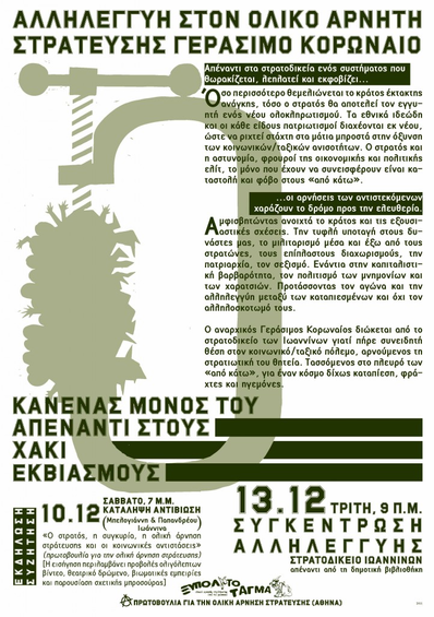 Την Τρίτη 13-12-2011, ο αναρχικός Γεράσιμος Κορωναίος δικάζεται από το στρατοδικείο Ιωαννίνων, για την πολιτική του επιλογή να αρνηθεί να εκπληρώσει τη στρατιωτική του θητεία. Ήδη από τον Οκτώβρη του 2009 ο Γεράσιμος Κορωναίος κατέθεσε δημόσια το σκεπτικό που τον οδήγησε στην εναντίωση στη θητεία ειδικά και στο μιλιταρισμό γενικότερα. Η στάση του αυτή δεν μπορεί παρά να μας βρει αλληλέγγυους.