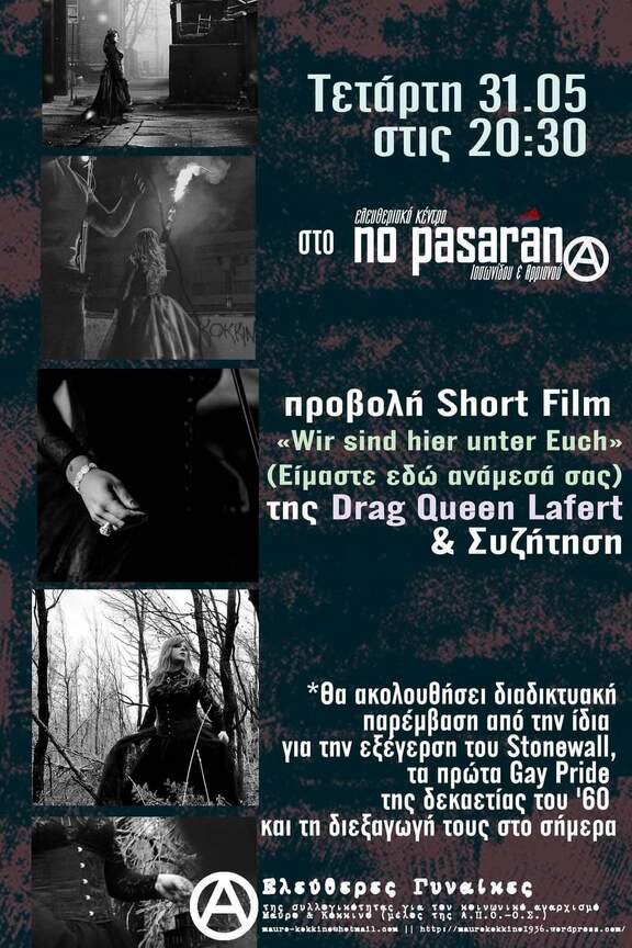 Προβολή short film: " Wir sind hier unter Euch", μεταφρ. " Είμαστε εδώ ανάμεσα σας", της Drag Queen Lafert, την Τετάρτη 31.5 στις 20:30 στο Ελευθεριακό Κέντρο No Pasaran.