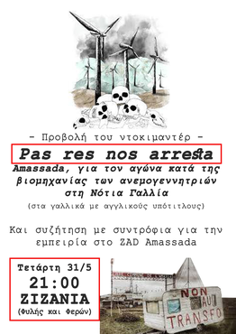 Projection of the documentary "Pas res nos arresta". Amassada, about the struggle against industrial wind turbine in the south of france (in french with greek subtitles).