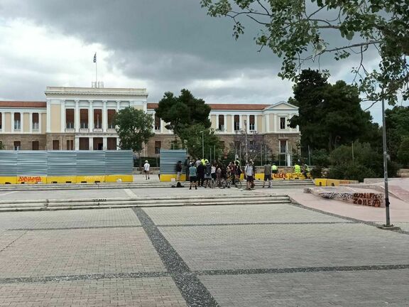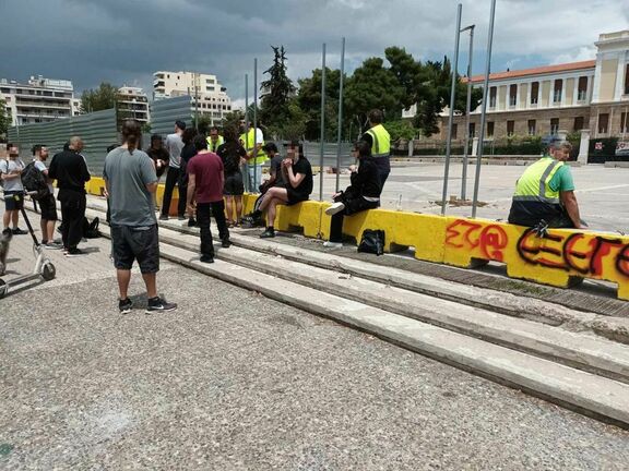Στη συνέχεια, κόσμος που έφτασε στην πλατεία κάθισε πάνω στις μπετονένιες βάσεις, αποτρέποντας τη συνέχιση της περίφραξης.