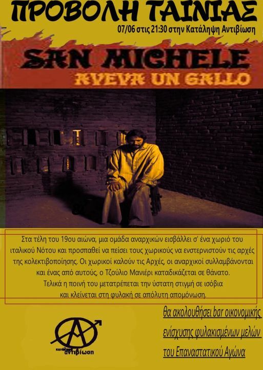 Στις 07/06 στις 21:30 θα πραγματοποιηθεί προβολή της ταινίας "san michele aveva un gallo" των αδερφών Taviani και ύστερα θα ακολουθήσει bar οικονομικής ενίσχυσης για φυλακισμένα μέλη του Επαναστατικού Αγώνα