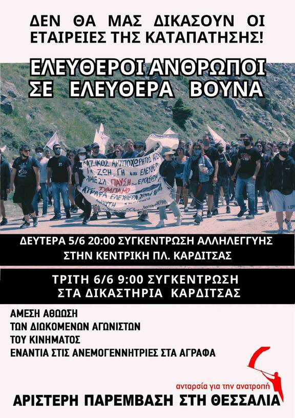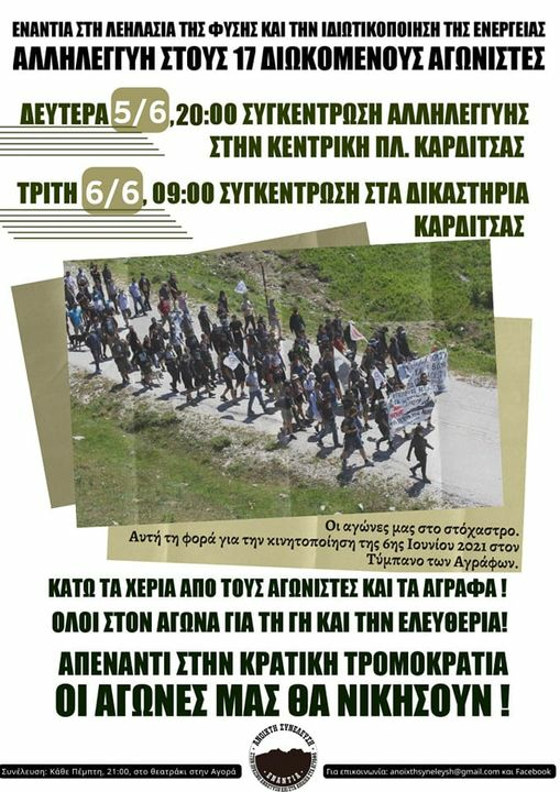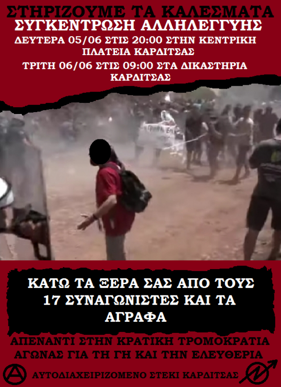 Αλληλεγγύη στους 17 διωκόμενους συναγωνιστές, που έχουν μπει στο στόχαστρο της Ασφάλειας εξαιτίας της συμμετοχής τους στην κινητοποίηση της 6ης Ιουνίου 2021 στον Τύμπανο των Αγράφων.
