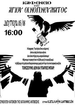 Η εκφραση "του Αγιου Οινοπνευματος" ειναι απλως ενα λογοπαιγνιο. Δεν ειναι ο στοχος να μπεκρουλιασουμε!Φερνουμε τα φαγητα και τα ξυδια μας (ή τα ψειριζουμε), τα βαζουμε στη μεση και διοργανωνουμε χωρις αντιτιμο την συντροφικη κουζινα. Τονιζουμε:δεν θα υπαρχει μπαρ!