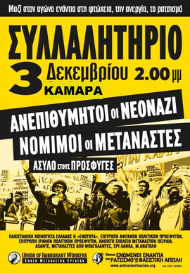 ΚΚαλούμε τους εργαζόμενους να συμμετέχουν μαζικά και να στηρίξουν το συλλαλητήριο το Σάββατο 3 Δεκέμβρη στην Καμάρα, 2μμ που διοργανώνεται από την Κίνηση Ενωμένοι Ενάντια στο Ρατσισμό και τη Φασιστική Απειλή, την Ένωση Μεταναστών Εργατών, την Πακιστανική Κοινότητα Ελλάδος, τις Επιτροπές Αφγανών και Ιρανών Πολιτικών Προσφύγων και άλλες κινήσεις.