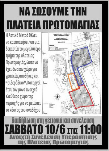 H πλατεία Πρωτομαγιάς, ένας από τους ελάχιστους ανοιχτούς δημόσιους χώρους στο κέντρο της Αθήνας, βρίσκεται υπό συνεχή απειλή να περικυκλωθεί από λαμαρίνες προκειμένου να μετατραπεί σε εργοτάξιο όπου θα εγκατασταθούν βαριά μηχανήματα, εξοπλισμός και γραφεία της εταιρείας ΑΤΤΙΚΟ ΜΕΤΡΟ. Xάρη στην έγκαιρη αντίδραση κάτοικων της περιοχής και αλληλέγγυου κόσμου, αποτράπηκε η ολοκλήρωση της περίφραξης της. Η παραχώρηση της πλατείας Πρωτομαγιάς στην εταιρεία ΑΤΤΙΚΟ ΜΕΤΡΟ που θα αποκλείσει τους περίοικους και πλήθος άλλων ανθρώπων από τις γειτονιές του κέντρου της πόλης, για τους οποίους αποτελεί σημείο κοινωνικοποίησης, συνεύρεσης και άθλησης, έως και την ολοκλήρωση του έργου το 2030, αναδεικνύει ξεκάθαρα την προνομιακή σχέση του κράτους με την ΑΤΤΙΚΟ ΜΕΤΡΟ. Μια εταιρεία η οποία, με την πλήρη υποστήριξη των κρατικών φορέων και του Δήμου, λειτουργεί στις γειτονιές της Αθήνας σαν να είναι τσιφλίκι της, περιφράσσοντας και καταπατώντας δημόσιους χώρους και πλατείες.