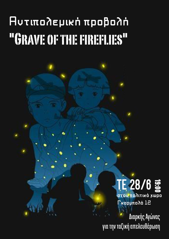 Αντιπολεμική προβολή της αντιπολεμικής anime ταινίας " Grave of the fireflies" (1988) του Isao Takahata, στον πολιτικό χώρο του Διαρκούς Αγώνα στη Γκαρμπολά 12. Διάρκεια 1 ώρα και 29 λεπτά.