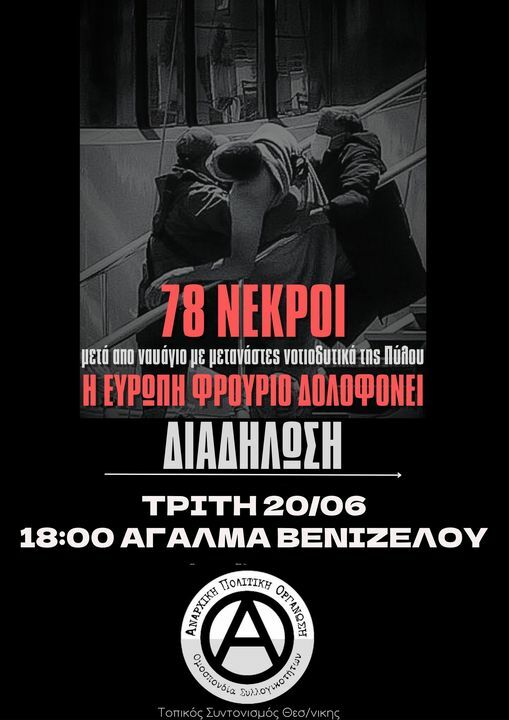 Το πρωί της Τετάρτης 14/6 βυθίστηκε στα ανοιχτά της Πύλου πλοίο με επιβαίνοντες μετανάστες με αποτέλεσμα τον επιβεβαιωμένο θάνατο δεκάδων ενώ ακόμα αγνοούνται εκατοντάδες. Άλλη μια φορά, με νωπές τις μνήμες της δολοφονίας των Τεμπών, το σάπιο εκμεταλλευτικό σύστημα που ζούμε δείχνει το πραγματικό του πρόσωπο με τον πιο βάναυσο τρόπο, δολοφονώντας, ουσιαστικά, αυτούς τους ανθρώπους, αυτήν την φορά μαζικότατα, αλλά και όλο αυτόν τον καιρό, λίγο-λίγο, καθημερινά, με τα pushbacks, το κυνήγι στα σύνορα, τους βιασμούς, τους αποκλεισμούς και την εξαθλίωση που βιώνουν.