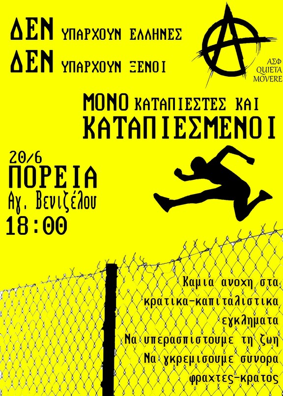 Είναι οι ίδιοι οι κυρίαρχοι που διεξάγουν πολέμους, που μας καταδικάζουν στη φτώχεια και την ανέχεια, που αναγκάζουν ανθρώπους να εκτοπιστούν από τις εστίες τους, που παρανομιμοποιούν και διαιρούν τους ανθρώπους με επίπλαστους εθνικούς διαχωρισμούς. Στην ίδια κατεύθυνση η Ευρώπη-Φρούριο που προωθείται ως πολιτική από τους κρατιστές και καπιταλιστές αναγκάζει εκατοντάδες χιλιάδες μετανάστες να επιλέξουν επισφαλείς τρόπους διέλευσης, προκειμένου να βελτιώσουν, με κάθε τρόπο, τους όρους και τις συνθήκες διαβίωσής τους, λαμβάνοντας κάθε ρίσκο για τη σωματική τους ακεραιότητα. Συνθήκες στις οποίες έχουν καταδικαστεί από τα κράτη και το υπερεθνικό κεφάλαιο.