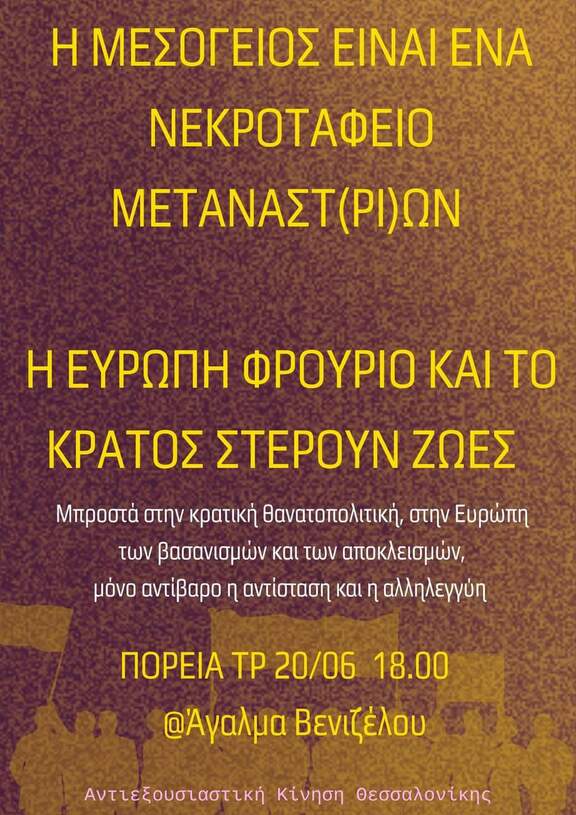 Στις 31/03, μόλις ένα μήνα μετά τη μαζική κρατική δολοφονία στα Τέμπη υπογράφηκε η συμφωνία για την "επέκταση" του φράχτη στον Έβρο κατά 35χλμ, ώστε να "αναβαθμιστεί" περαιτέρω η θωράκιση των εξωτερικών συνόρων της Ελλάδας και κατ' επέκταση και της Ευρώπης. Τα push-backs, οι παράνομες δηλαδή επαναπροωθήσεις μεταναστών, εξακολουθούν σε καθημερινή βάση, τα ναυάγια και οι πνιγμοί όσων επιχειρούν να διασχίσουν τα θαλάσσια σύνορα συνεχίζονται απρόσκοπτα, οι μετανάστες στοιβάζονται στα στρατόπεδα συγκέντρωσης και όσοι είχαν την "τύχη" να μείνουν σε κάποιο σχετικά αξιοπρεπές οίκημα μέσω κάποιου προγράμματος στέγασης, τώρα πετιούνται στο δρόμο. Παράλληλα οι κυβερνητικοί εκπρόσωποι και σύσσωμος ο κρατικός μηχανισμός σπεύδει να διαψεύσει τα δημοσιεύματα των New York Times που μιλούν για μυστικές φυλακές στον Έβρο όπου γίνονται συστηματικά βασανιστήρια, συνεχίζεται αδιάκοπα η προσπάθεια αποκλεισμού και εκτοπισμού των μεταναστ(ρι)ών από τον κοινωνικό ιστό και το κέντρο των πόλεων, η διαδικασία χορήγησης ασύλου ολοένα και δυσχεραίνει και το νομικό οπλοστάσιο του κράτους αναβαθμίζεται μέσα από την πρόταση σχεδίου νόμου για το "Νέο Κώδικα Μετανάστευσης". Και φυσικά τα Μ.Μ.Ε. σε απόλυτη αρμονία με τις κρατικές - κυβερνητικές επιταγές χρησιμοποιούν το θάνατο τόσων ανθρώπων για να διαχύσουν μία ακόμη φορά το ρατσιστικό και ξενοφοβικό δηλητήριο τους, επιχειρώντας να μεταφέρουν τις ευθύνες για τις ελλείψεις ασθενοφόρων και γενικά για τη διάλυση του Ε.Σ.Υ. στους μετανάστες!