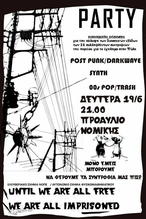 Bar/Party οικονομικής ενίσχυσης για τα δικαστικά έξοδα των 21 συλληφθέντων από την πορεία της 15/6 για το κρατικό έγκλημα στην Πύλο. Τα 19 από τα συλληφθέντα αντιμετωπίζουν κακουργηματικού χαρακτήρα κατηγορίες και περνούν από ανακριτή την Τρίτη 20/6. Έως τότε πρέπει να συγκεντρωθεί ένα πολύ μεγάλο χρηματικό ποσό για τα δικαστικά τους έξοδα. Ως ελάχιστη ένδειξη αλληλεγγύης ερχόμαστε Δευτέρα βράδυ Νομικη για να στηρίξουμε τα συντρόφια μας. Η αλληλεγγύη είναι το όπλο μας!
