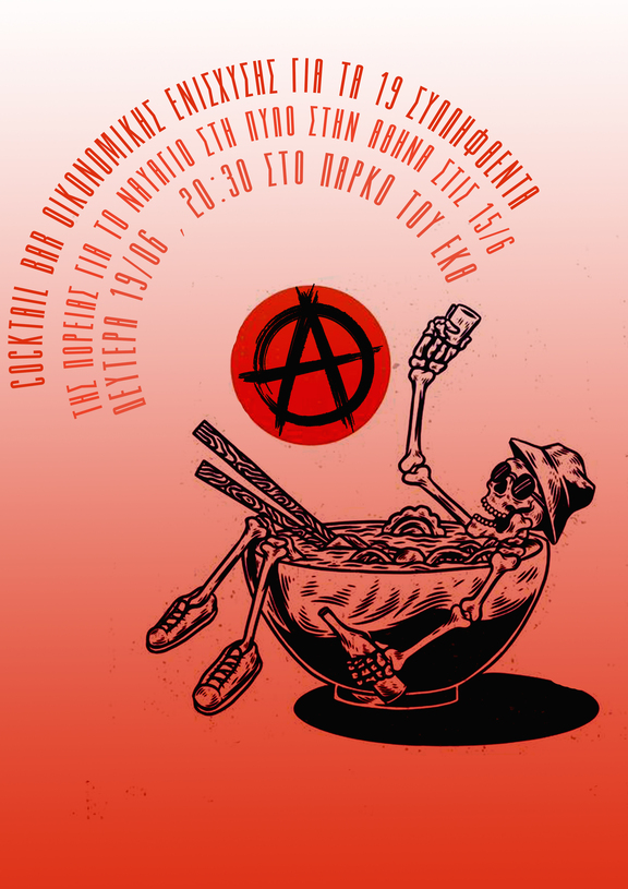 Την Πέμπτη 15/6 πραγματοποιήθηκε πορεία στο κέντρο της Αθήνας -όπως και σε άλλες πόλεις- ενάντια στην κρατική δολοφονία 100αδων μεταναστ(ρι)ών στο ναυάγιο της Πύλου. Κατα τη διάρκεια της πορείας η αστυνομία προχώρησε σε 21 συλλήψεις. Οι 2 είναι με κατηγορίες πλημμεληματικού χαρακτήρα και οι 19 με κακουργηματικού. Την Παρασκευή το πρωί, τα 2 συλληφθέντα με τις πλημμεληματικές κατηγορίες πέρασαν τη διαδικασία του αυτοφώρου, πήραν αναβολή και αφέθηκαν. Τα υπόλοιπα 19 συλληφθέντα ζήτησαν προθεσμία κι από τότε κρατούνται στην ΓΑΔΑ και το ΑΤ Μενιδίου έως και την Τρίτη 20/6, όποτε και θα περάσουν από ανακριτή. Λόγω του κακουργηματικού χαρακτήρα των διώξεων των συντρόφων και των συντροφισσών που κρατούνται, το ποσό που πρέπει να συγκεντρωθεί για την παρουσία τους στον ανακριτή είναι μεγάλο.