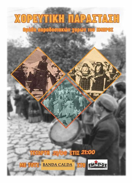 Την Τετάρτη 21 Ιουνίου η ομάδα παραδοσιακών χορών του θεάτρου Εμπρος παρουσιάζει χορούς από την Μακεδονία και την Θράκη μέχρι την Κόνιτσα και τα Νησια του Αιγαίου , στην ετήσια μουσικοχορευτική μας παράσταση. Σας περιμένουμε να μας τιμήσετε με την παρουσία σας.