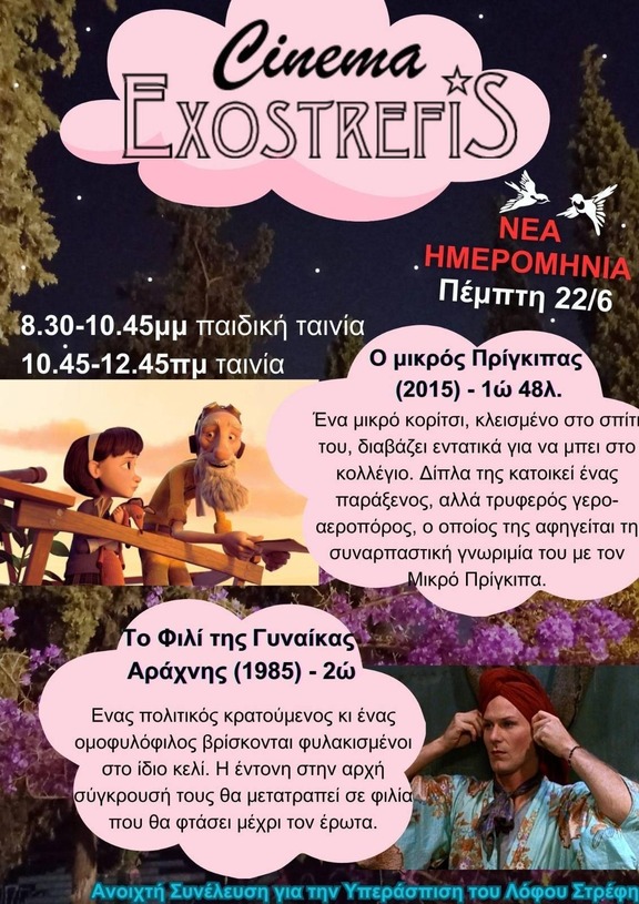 Η προβολή των ταινιών που αναβλήθηκε την προηγούμενη εβδομάδα προγραμματίζεται εκ νέου για Πέμπτη 22/6. Ξεκινάμε στις 20:30 με την παιδική ταινία "Ο μικρός Πρίγκιπας" (2015, 1ω 48λ) και συνεχίζουμε στις 22:45 με "Το φιλί της αράχνης" (1985, 2ω).