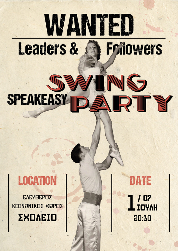 Ένα Speakeasy Swing Party συμβαίνει στην πόλη. Η ακριβής του διεύθυνση είναι μυστική και πρέπει να ψάξεις το πιο όμορφο κατειλημμένο νεοκλασικό, να ανέβεις τα σκαλιά και να βρεις καταφύγιο στη δροσερή του αυλή. Μπροστά σου θα δεις τον κόσμο να κινείται σε ρυθμούς τσάρλεστον και μελωδίες σουίνγκ. Μόλις ανακάλυψες την γοητεία της τζαζ! Και μην ξεχάσεις να περάσεις μια βόλτα από το μπαρ: giggle water, sweet water, black poison, dirty juice και άλλα πολλά "μη αλκοολούχα" ποτά.