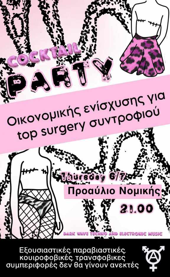 Σε μια κοινωνία που δεν υπάρχει χώρος για τίποτα άλλο πέρα από την ετεροκανονικοτητα, το μόνο που έχουμε είναι το ένα το άλλο. Η αλληλεγγύη είναι το όπλο μας, σκατα στο δίπολο γυναίκα άντρα, σκατα στην κοινωνία οργανωμένης σήψης και συνεχής καταπίεσης. Διοργανώνουμε κοκτέιλ πάρτυ την Πέμπτη 6/7 για τρανς ιατρικά έξοδα (top surgery) συντροφιού στο προαύλιο της Νομικής από τις 21.00. Εξουσιαστικές,παραβιαστικές,κουιροφοβικές,τρανσφοβικές συμπεριφορές δεν θα γίνουν ανεκτές.