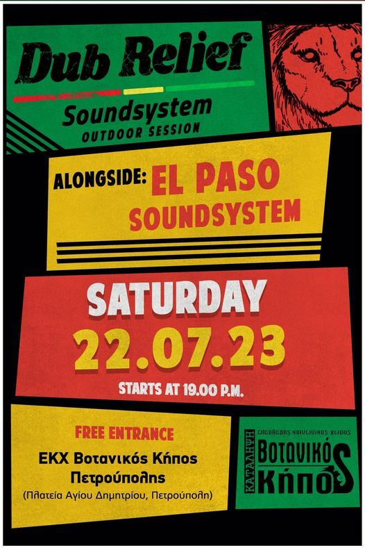 Το Σάββατο 22/7 οι Dub Relief και οι El Paso Soundsystem θα μοιραστούν και θα μοιράσουν μουσικές και θετική ενέργεια σε ένα outdoor full soundsystem Reggae Dub session!