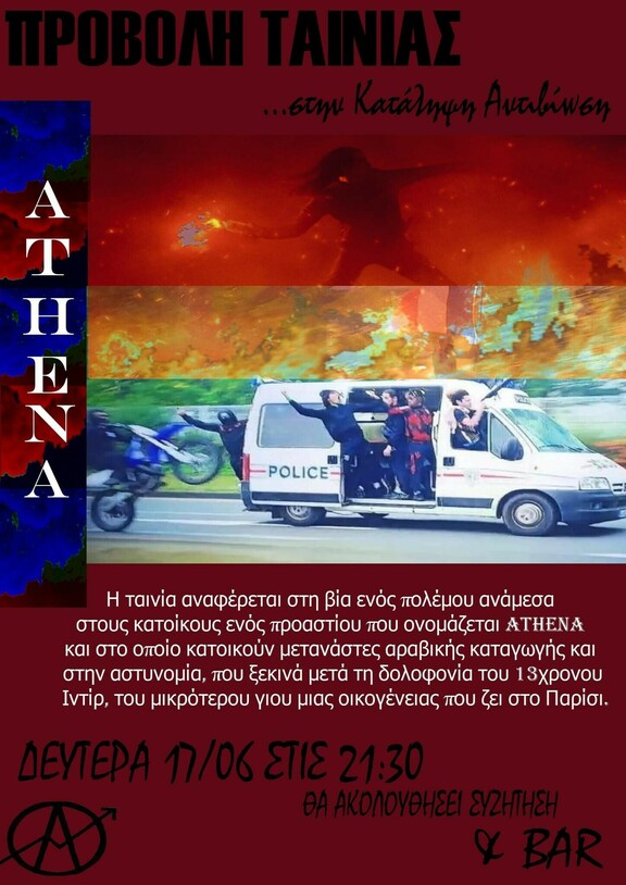 Την Δευτέρα 17/06 σας περιμένουμε κατά τις 21:30 στην αυλή μας για να δούμε μαζί το ATHENA και έπειτα να συζητήσουμε με βάση την ταινία, συνδυάζοντας την με την εξεγερμένη Γαλλία. Θα ακολουθήσει μπαρ για την οικονομική ενίσχυση του ταμείου της κατάληψης.