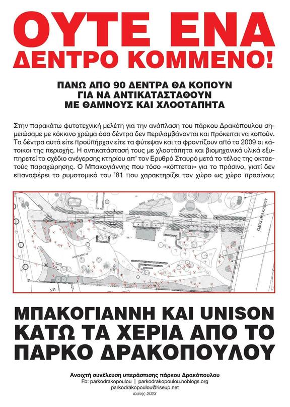 Δεν θα ανεχτούμε ούτε μία κοπή δέντρου. Το επίσημο και δημοσιευμένο φυτοτεχνικό σχέδιο (ΑΠ-ΔΡΑΚ-ΣΧΦΥΤ, Μάιος 2023) αποκρύπτει και δεν περιλαμβάνει την ύπαρξη περίπου 90 ώριμων δέντρων καθώς και όλων των νέων φυτεύσεων που έχουν φυτευτεί από τους κατοίκους από το 2009 μέχρι φέτος. H αντικατάστασή τους με χλοοτάπητα και βιομηχανικά αδρανή υλικά που σχεδιάζεται εξυπηρετεί το σχέδιο ανέγερσης κτηρίου απ' τον Ερυθρό Σταυρό μετά το τέλος της οκταετούς παραχώρησης.