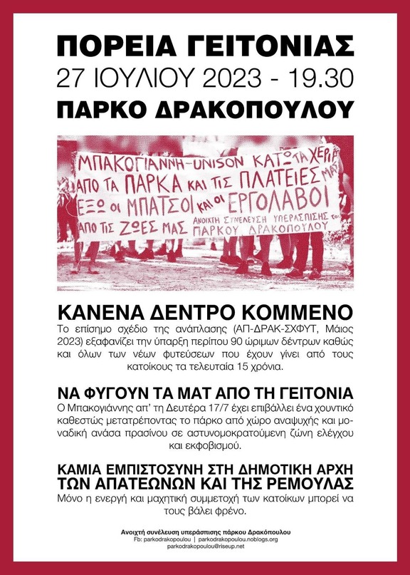 Για μια ακόμη φορά, ο δήμος Αθηναίων και ο δήμαρχος Μπακογιάννης επιχειρεί να καταστείλει όσες και όσους αντιστέκονται απέναντι στην καταστροφή των δημόσιων χώρων, αυτή τη φορά τους κατοίκους και τους αλληλέγγυους στο πάρκο Δρακόπουλου, μέσω της επιστράτευσης ενός αστυνομικού στρατού (ΟΠΚΕ, ΜΑΤ, ΔΡΑΣΗ, Δημοτική Αστυνομία), της επίθεσης ΜΑΤ σε διαδηλωτές στις 17 Ιουλίου μετά από πορεία προάσπισης του πάρκου, της απόδοσης σαθρών κατηγοριών σε συλληφθέντα διαδηλωτή, της επιβολής μια συνθήκης αστυνομοκρατίας στη γειτονιά.