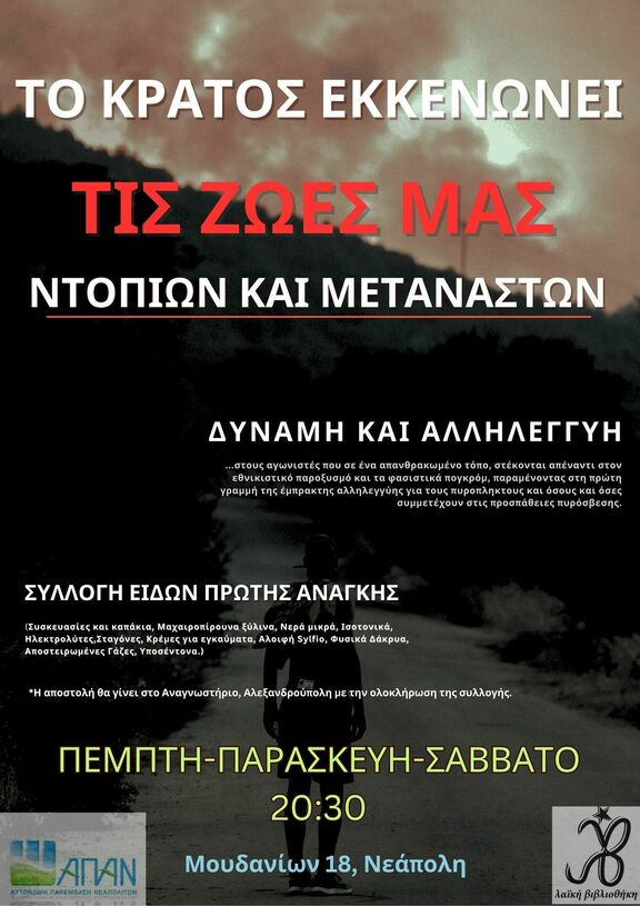 ...στους αγωνιστές που σε ένα απανθρακωμένο τόπο, στέκονται απέναντι στον εθνικιστικό παροξυσμό και τα φασιστικά πογκρόμ, παραμένοντας στη πρώτη γραμμή της έμπρακτης αλληλεγγύης για τους πυροπληκτους και όσους και όσες συμμετέχουν στις προσπάθειες πυρόσβεσης.