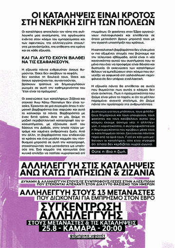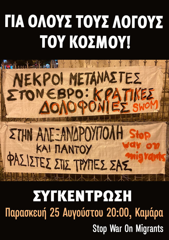 Οι θάνατοι μεταναστών στον Έβρο ως αποτέλεσμα της μη διάσωσής τους από τις πυρκαγιές είναι δολοφονία. Οι είκονες που ήρθαν στη δημοσιότητα όπου κυνηγοί κεφαλών είτε απαγάγουν μετανάστες είτε συμμετέχουν σε πογκρόμ εναντίον τους, μας υπενθυμίζουν την πραγματικότητα των συνόρων και της σχέσης φασιστών-κράτους. Η συνωμοσιολογική ενοχοποίηση των μεταναστών ως εμπρηστών, είναι σενάριο που θυμίζει τη στοχοποίησή τους ως φορείς του covid19, την ενοχοποίησή τους για την ανεργία, ως βιαστές και συνολικά όλων των δεινών του ντόπιου πληθυσμού της ελλάδας. Η απλούστευση της πραγματικότητας που προσφέρει το εθνικιστικό αφήγημα αποπροσανατολίζει από τους πραγματικούς υπαιτίους της εκμετάλλευσης και της αφαίμαξης του προλεταριάτου, των ελλήνων αφεντικών (μικρών ή μεγάλων) και του κράτους τους.Η δημιουργία αυτού του μισανθρωπικού αφηγήματος εποφελεί μεγάλη μερίδα κρατικοδίαιτων ρουφιάνων, όπως στρατιωτικών, αστυνομίας, φασιστών, συνοριοφυλάκων, ιδιοκτητών και τσιφλικάδων, οι οποίοι βγάζουν το ψωμί τους από τον πόλεμο ενάντια στους μετανάστες και από την "καταπολέμηση" του εσωτερικού εχθρού. Η προσπάθεια φίμωσης και τραμπουκισμού των αντιφασιστικών φωνών στην Αλεξανδρούπολη σε συνδυασμό με τα πογκρόμ και τα στημένα κατηγορητήρια εναντίον μεταναστών, πρέπει να θορυβήσει την κοινωνική βάση και να ωθήσει σε μια πολυεθνική-ταξική αντίσταση απέναντι στο ρατσισμό και τη φασιστικοποίηση.