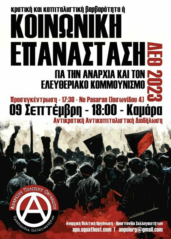 Δεν τρέφουμε αυταπάτες πως υπάρχει τρόπος να εξωραϊστεί και να εξανθρωπιστεί το κρατικό και καπιταλιστικό σύστημα. Η υπέρασπιση των εργατικών συμφερόντων, των αναγκών, της ζωής και της αξιοπρέπειάς μας περνά μέσα από την κοινή, οριζόντια συντονισμένη, οργανωμένη από τα κάτω δράση. Απέναντι στην οργανωμένη επίθεση του κράτους και του κεφαλαίου, η μόνη λύση βρίσκεται στην Οργάνωση του αγώνα των καταπιεσμένων κι εκμεταλλευόμενων. Άλλωστε η ιστορία των κοινωνικών και ταξικών κινημάτων που πάλεψαν διεκδικώντας έναν κόσμο χωρίς εκμετάλλευση και καταπίεση, μας δείχνει οτι η κοινωνική αλληλεγγύη μεταξύ των καταπιεσμένων ξένων ή ντόπιων αποτελεί το όπλο μας ενάντια στους κοινούς μας δυνάστες. Ό,τι έχει να κερδηθεί θα είναι αποτέλεσμα των πλατιών, οργανωμένων στη βάση, μαχητικών και ριζοσπαστικών αγώνων μας. Το μόνο πραγματικό δίλημμα της εποχής μας είναι: κρατική και καπιταλιστική βαρβαρότητα ή Κοινωνική Επανάσταση. Ως αναρχικοί/ες προτάσσουμε το δρόμο της Κοινωνικής Επανάστασης ως τη μόνη ρεαλιστική προοπτική για μια ζωή με αξιοπρέπεια, για μια κοινωνία που θα οικοδομηθεί στη βάση της ισότητας, της αλληλεγγύης, της δικαιοσύνης και της ελευθερίας. Για έναν κόσμο που θα χωράει πολλούς κόσμους, αυτόν της αναρχίας και του ελευθεριακού κομμουνισμού.