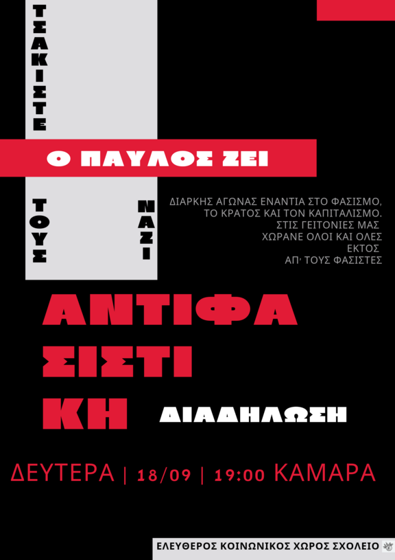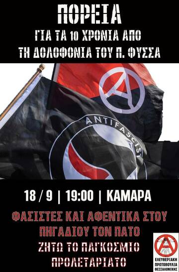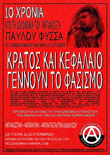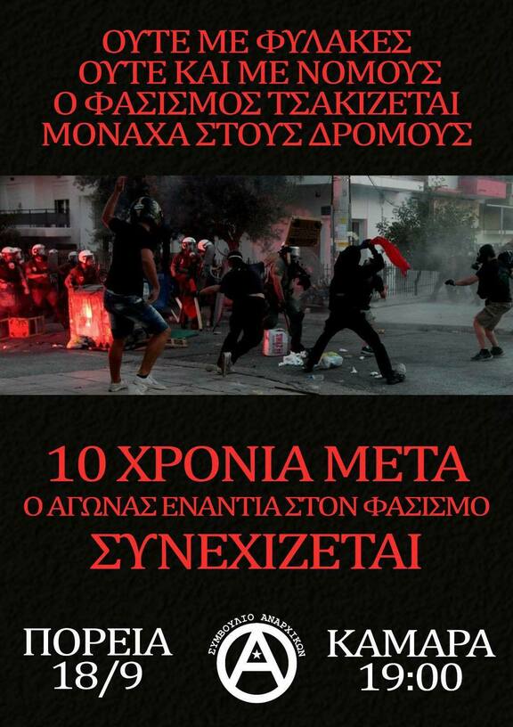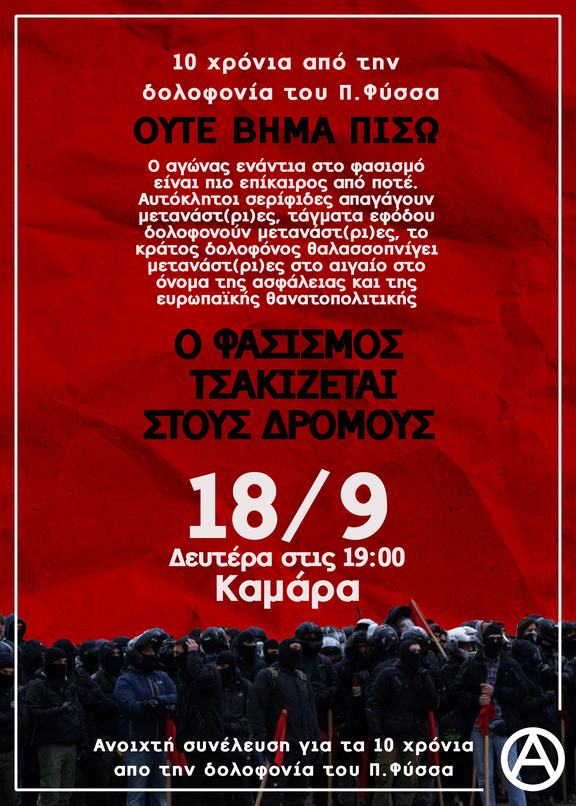 - Στην αυριανή αντιφασιστική πορεία για τα 10 χρόνια από τη δολοφονία του Παύλου Φύσσα από τάγμα εφόδου της Χρυσής Αυγής - Δευτέρα 18 Σεπτεμβρίου, 7μμ, Καμάρα