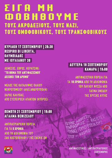 - Στην αντιπατριαρχική πορεία για τα 5 χρόνια από τη δολοφονία του Ζακ Κωστόπουλου/της Zackie Oh - Πέμπτη 21 Σεπτεμβρίου, 7μμ, Άγαλμα Βενιζέλου