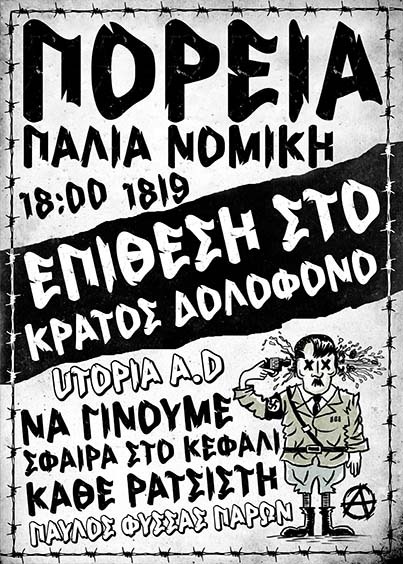 Αντιφασιστική Πορεία μνήμης για τα 10 χρόνια από τη δολοφονία του αντιφασίστα Παύλου Φύσσα από τα τάγματα εφόδου των νεοναζί της χρυσής αυγής. Δευτέρα 18/09 και ώρα 18:00 στην παλιά νομική. Επίθεση στο κράτος δολοφόνο. Να γίνουμε σφαίρα στο κεφάλι κάθε ρατσιστή. Παύλος Φύσσας Παρών.
