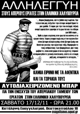ΣΑΒΒΑΤΟ 17/12/11 - ΩΡΑ 21.00- ΑΥΤΟΔΙΑΧΕΙΡΙΖΟΜΕΝΟ ΜΠΑΡ ΓΙΑ ΤΗΝ ΕΝΙΣΧΥΣΗ ΤΟΥ ΑΠΕΡΓΙΑΚΟΥ ΤΑΜΕΙΟΥ ΤΩΝ ΕΡΓΑΤΩΝ ΣΤΗΝ ΕΛΛΗΝΙΚΗ ΧΑΛΥΒΟΥΡΓΙΑ