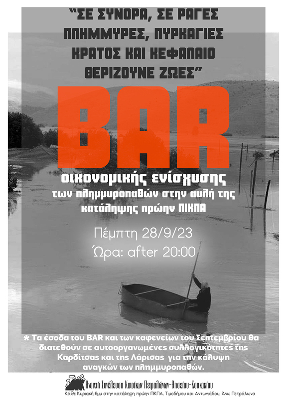 BAR οικονομικής ενίσχυσης των πλημμυροπαθών / Αυλή κατάληψης πρώην ΠΙΚΠΑ / Πέμπτη 28 Σεπτεμβρίου μετά τις 8μμ
