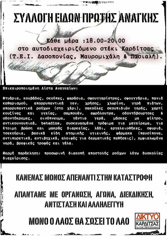 Την Κυριακή 24/09 από τις 20:00 και μετά ο χώρος του Α.Κοι.Χ.Ι. θα είναι ανοιχτός με σκοπό τη συλλογή αναγκαίων ειδών για τους πλημμυροπαθείς στην Καρδίτσα. Η λίστα που αναπαράγουμε είναι ανανεωμένη σύμφωνα με τις τωρινές ανάγκες. Τα πράγματα που θα συλλεχθούν θα μεταφερθούν από εμάς και θα παραδοθούν σε συνεργασία με το στέκι στην Καρδίτσα εξώ από διαμεσολαβήσεις και τυχόν πελατειακές σχέσεις, όπως έχει ήδη γίνει δύο φορές μέχρι τώρα (προσεχώς θα γίνει εκτενέστερη ανάρτηση).