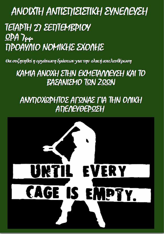 Σε συνέχεια των δράσεων του Ιουνίου και Ιουλίου ενάντια στη βιομηχανία δέρματος και γούνας και την εκμετάλλευση των ιπποειδών, καλείται νέος κύκλος συνελεύσεων με σκοπό την οργάνωση δράσεων για την ολική απελευθέρωση.