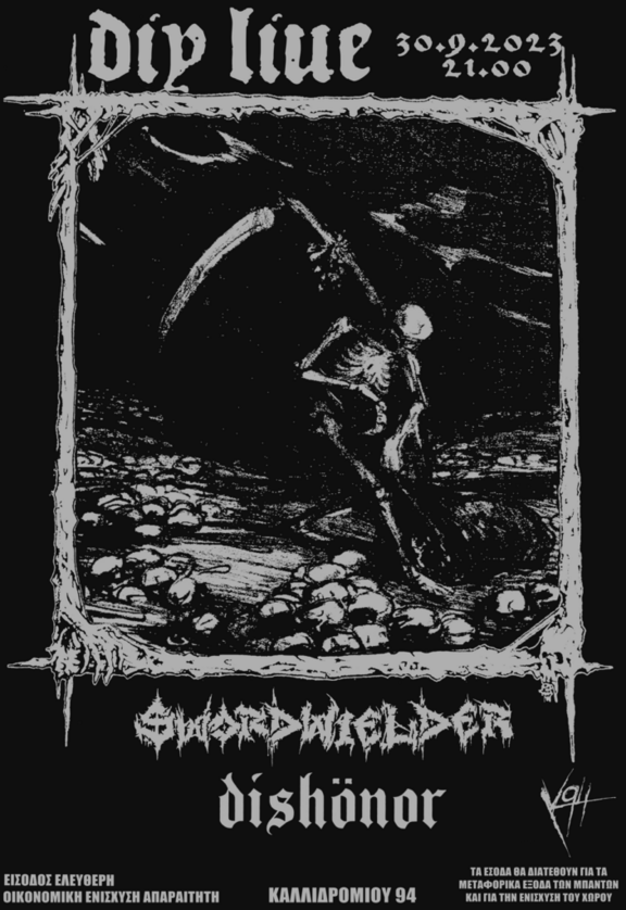 Το Σάββατο 30 του Σεπτέμβρη, κατηφορίζουμε στο υπόγειο για το πρώτο live της χρονιάς, μαζί με Dishonor από Θεσσαλονίκη και Swordwielder από Σουηδία. Είσοδος ελεύθερη. Η ελεύθερη οικονομική ενίσχυση, θα διατεθεί για τα μεταφορικά των μπαντών και την στήριξη του χώρου. Το live θα ξεκινήσει στις 21:00.