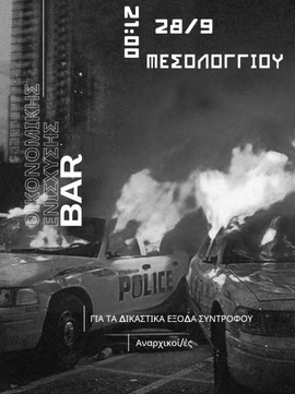 Bar οικονομικής ενίσχυσης για τα δικαστικά έξοδα συντρόφου, Πέμπτη 26/9 στις 21:00, πεζόδρομος Μεσολογγίου