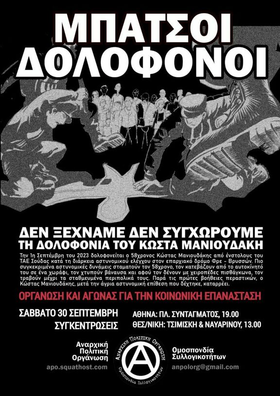 Το Σάββατο 30 Σεπτεμβρίου, καλούμε σε συγκέντρωση ενάντια στην κρατική δολοφονία του Κώστα Μανιουδάκη, στις 19:00 στην πλατεία συντάγματος. Ακολουθεί το κείμενο της συνέλευσης.