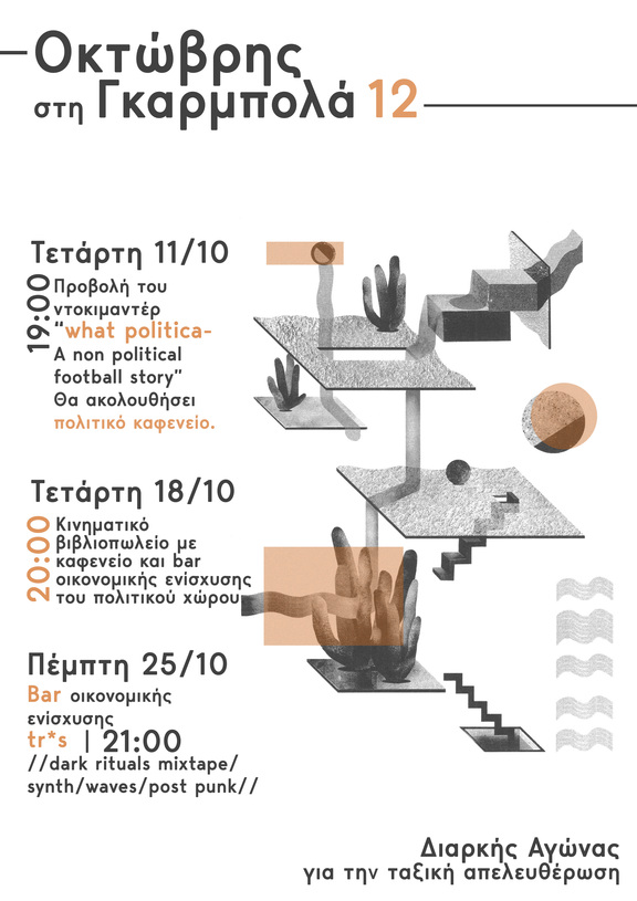 Άνοιγμα του πολιτικού χώρου του "Διαρκούς Αγώνα για την ταξική απελευθέρωση" στη Γκαρμπολά 12. Θα λειτουργεί παράλληλα στο χώρο κινηματικό βιβλιοπωλείο, ενώ θα υπάρχει καφενείο και bar.