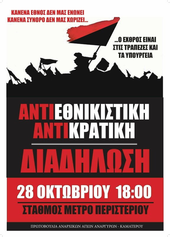 Ο αγώνας ενάντια στον εθνικισμό και τον φασισμό είναι κομμάτι του αγώνα ενάντια στον καπιταλισμό και το κράτος, είναι κομμάτι του συνολικότερου αγώνα για την κοινωνική και την ταξική απελευθέρωση. Γι' αυτό και επιλέγουμε την 28η Οκτωβρίου, μια μέρα εθνικών εορτών και μιλιταριστικών παρελάσεων, μια μέρα έκφρασης του επίσημου κρατικού εθνικισμού και των εθνικών μύθων, να είμαστε στους δρόμους. Γ' αυτό και καλούμε σε αντιεθνικιστική και αντικρατική διαδήλωση το Σάββατο της 28ης Οκτωβρίου στις 18.00 με αφετηρία την πλατεία Δημαρχείου στο Περιστέρι (μετρό Περιστέρι) την τοπική κοινωνία των ταξικά προσδιορισμένων φτωχογειτονιών των δυτικών προαστίων, τις λαϊκές συνελεύσεις, τα εργατικά και φοιτητικά σχήματα, τα σωματεία βάσης και σύσσωμο το αναρχικό, αντιεξουσιαστικό και ελευθεριακό κίνημα.
